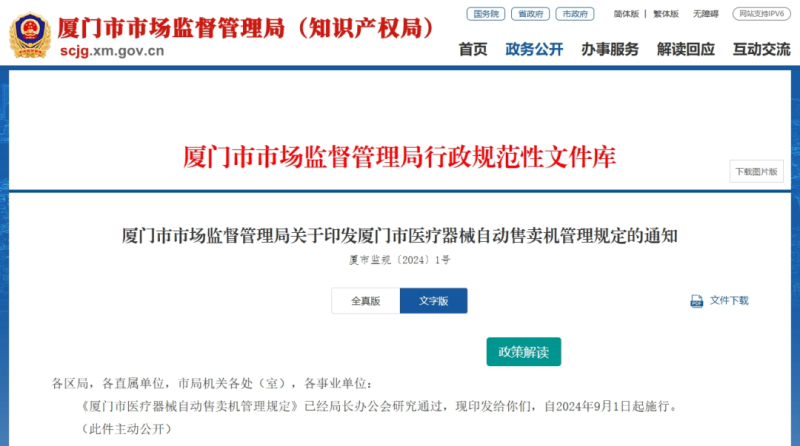 近日,廈門市市場(chǎng)監(jiān)督管理局發(fā)布《廈門市醫(yī)療器械自動(dòng)售賣機(jī)管理規(guī)定》(以下簡(jiǎn)稱《管理規(guī)定》),對(duì)醫(yī)療器械經(jīng)營(yíng)企業(yè)設(shè)置自動(dòng)售械機(jī)的備案流程予以明確,并對(duì)自動(dòng)售械機(jī)的經(jīng)營(yíng)主體、經(jīng)營(yíng)范圍、基本原則以及質(zhì)量管理體系等提出要求。