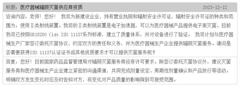 輻照滅菌是不少無(wú)菌醫(yī)療器械選擇的滅菌方式之一,那么作為一家已按照GB 18280(IDT ISO 11137)系列標(biāo)準(zhǔn)建立了質(zhì)量體系,并對(duì)設(shè)備進(jìn)行了驗(yàn)證的輻照滅菌服務(wù)商,是否需要獲得ISO 11137認(rèn)證證書(shū)或其他資質(zhì)要求才可以提供滅菌服務(wù)呢?