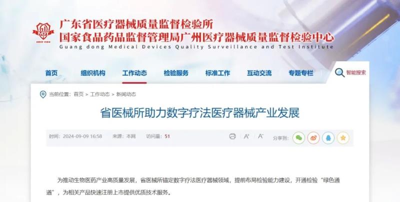 近日,廣東省醫(yī)療器械質(zhì)量監(jiān)督檢驗(yàn)所(以下簡(jiǎn)稱“省醫(yī)械所”)發(fā)布動(dòng)態(tài)稱,為推動(dòng)生物醫(yī)藥產(chǎn)業(yè)高質(zhì)量發(fā)展,省醫(yī)械所錨定數(shù)字療法醫(yī)療器械領(lǐng)域,提前布局檢驗(yàn)?zāi)芰ㄔO(shè),開(kāi)通檢驗(yàn)“綠色通道”,為相關(guān)產(chǎn)品快速注冊(cè)上市提供優(yōu)質(zhì)技術(shù)服務(wù)。