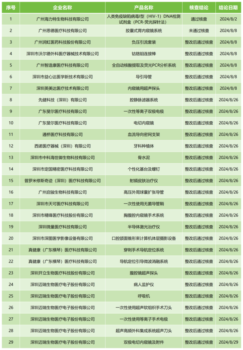 9月13日,廣東省藥監(jiān)局官網(wǎng)公布2024年8月醫(yī)療器械注冊質(zhì)量管理體系核查結(jié)果,包括普羅米修斯奇跡(深圳)醫(yī)療科技有限公司的射頻皮膚治療儀、深圳微量醫(yī)療科技有限公司的半導(dǎo)體激光治療儀、深圳邁瑞生物醫(yī)療電子股份有限公司的呼吸機(jī)等共計(jì)29款產(chǎn)品,其中廣州海力特生物科技有限公司的人類免疫缺陷病毒I型(HIV-1)DNA檢測試劑盒(PCR-熒光探針法)核查結(jié)論為“通過核查”,廣州思德醫(yī)療科技有限公司的膠囊式胃內(nèi)窺鏡系統(tǒng)核查結(jié)論為“未通過核查”,其余均為“整改后通過核查”。具體明細(xì)見下方表格: