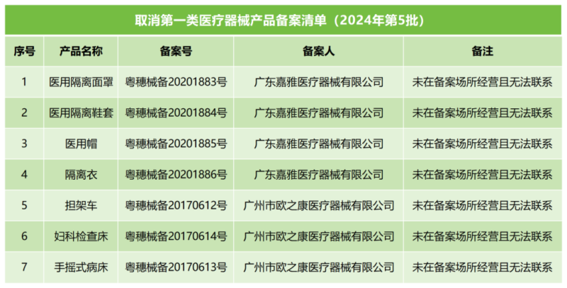 因此,該局現(xiàn)公告取消以上兩家企業(yè)的2個第一類醫(yī)療器械生產(chǎn)備案(備案號分別為粵穗食藥監(jiān)械生產(chǎn)備20200352號&粵穗食藥監(jiān)械生產(chǎn)備20170092號),以及7個第一類醫(yī)療器械產(chǎn)品備案,其中產(chǎn)品備案取消的具體清單如下: