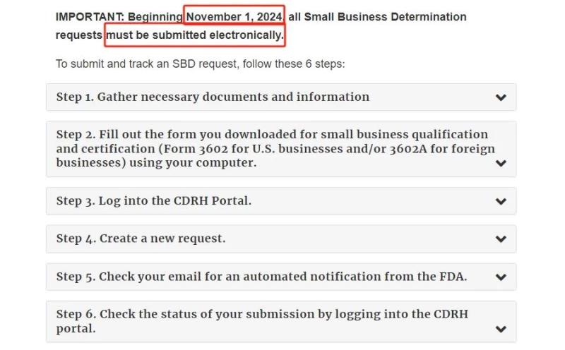 公告提到,從2024年10月1日開始,F(xiàn)DA將接受電子形式的小企業(yè)認定(SBD)請求。支持請求的所有文件都可以通過Customer Collaboration Portal(CDRH Portal) 提交。