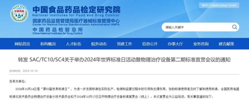 10月16日,中檢院官網(wǎng)轉(zhuǎn)發(fā)了一則標(biāo)準(zhǔn)宣貫會(huì)議通知,其中提到,全國醫(yī)用電器標(biāo)準(zhǔn)化技術(shù)委員會(huì)物理治療設(shè)備分技術(shù)委員會(huì)定于10月17日(周四)召開物理治療設(shè)備標(biāo)準(zhǔn)宣貫會(huì)(線上),具體宣貫內(nèi)容、時(shí)間及參會(huì)方式如下: