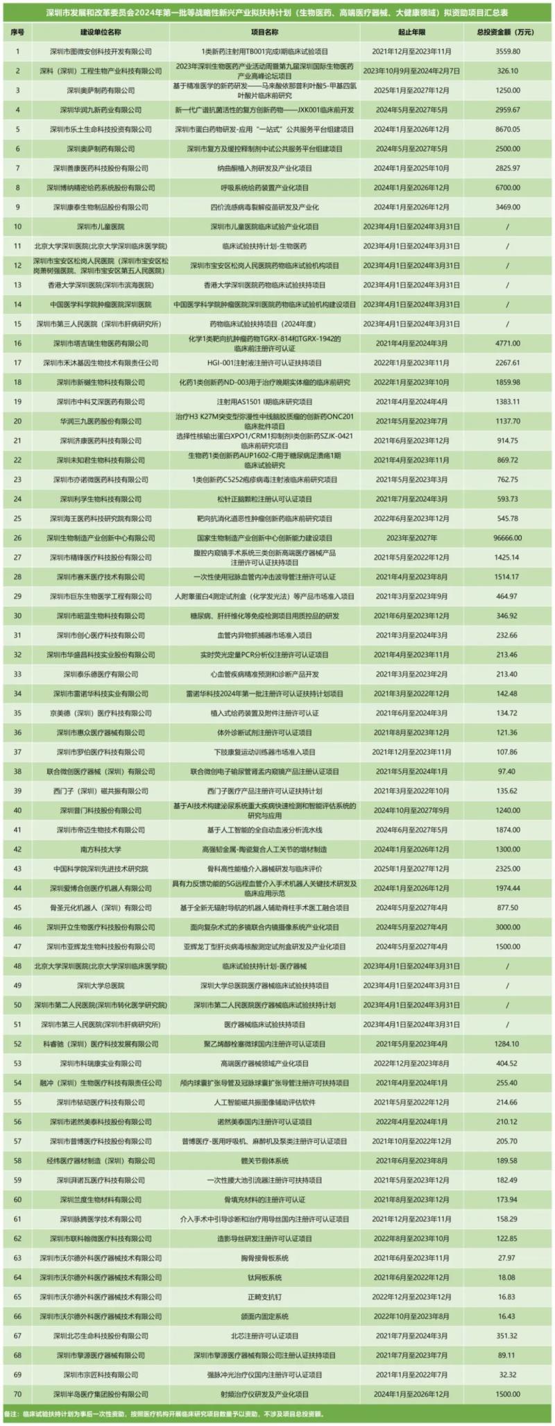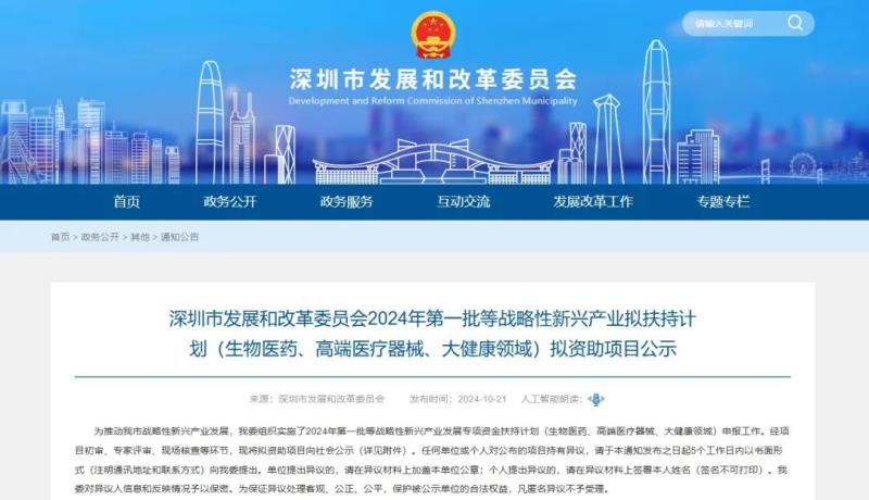 10月21日,深圳市發(fā)展和改革委員會(huì)發(fā)布了2024年第一批戰(zhàn)略性新興產(chǎn)業(yè)扶持計(jì)劃(生物醫(yī)藥、高端醫(yī)療器械、大健康領(lǐng)域)擬資助項(xiàng)目,公示時(shí)間為5個(gè)工作日。我們通過查閱附件表格后發(fā)現(xiàn),本批共有70個(gè)擬資助項(xiàng)目,包括醫(yī)藥領(lǐng)域臨床前研究、臨床試驗(yàn)扶持、注冊(cè)許可扶持等,總投資金額最高的為96666萬元。深圳發(fā)改委將根據(jù)此前公布的相應(yīng)領(lǐng)域的專項(xiàng)資金項(xiàng)目申報(bào)指南,按總投資金額的一定比例對(duì)企業(yè)進(jìn)行補(bǔ)貼。