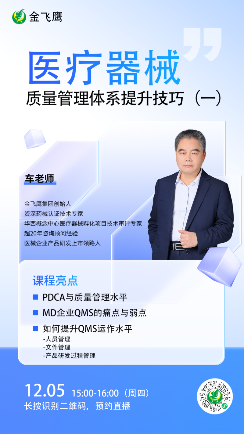 金飛鷹直播培訓(xùn)簡介 金飛鷹直播培訓(xùn),是每周一次的固定培訓(xùn)欄目,優(yōu)選金飛鷹國內(nèi)外資深注冊/項目老師定期為大家講解醫(yī)療器械注冊相關(guān)知識,解答大家在醫(yī)療器械注冊過程中的諸多疑問。 此前我們已為大家?guī)硇掳驷t(yī)療器械生物學(xué)評價標(biāo)準(zhǔn)、新版醫(yī)療器械風(fēng)險管理標(biāo)準(zhǔn)、醫(yī)療器械軟件注冊、新版醫(yī)療器械經(jīng)營質(zhì)量管理規(guī)范等共計105次線上培訓(xùn)課程,有興趣的可點(diǎn)擊視頻號直播回放進(jìn)行查看~另外大家也一定很關(guān)注接下來的培訓(xùn)主題,相關(guān)培訓(xùn)預(yù)告我們會陸續(xù)添加至視頻號,請大家持續(xù)關(guān)注哦!