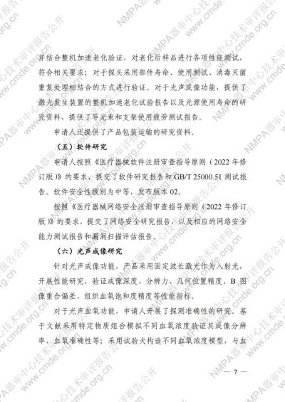 產(chǎn)品利用超聲回波及多普勒等原理,實現(xiàn)對人體組織的超聲成像。產(chǎn)品具有多種不同的成像模式和后處理功能,不涉及深度學習算法??蛇x配不同型號的探頭以及穿刺架、耦合劑加熱器等不同部件。 除常規(guī)超聲功能外,本產(chǎn)品還具有光聲成像功能,在線陣探頭的基礎上增加同步輸出的近紅外激光,當組織被激光照射吸收光的部分能量后產(chǎn)生熱膨脹,并以特定機械波的形式釋放出去從而產(chǎn)生相應頻率的超聲信號,探頭接受該信號傳輸?shù)街鳈C經(jīng)過處理后將其強度和特征體現(xiàn)為圖像,從而反應出組織初始的光吸收分布。由于人體組織對于不同波長的光吸收程度不同,當前所用兩束不同波長的激光對于血紅蛋白的吸收程度不同,通過對比就可以計算出含氧血紅蛋白和不含氧血紅蛋白比例,進而反映該區(qū)域組織中血氧的分布情況。光聲成像的結(jié)果可以和常規(guī)二維及血流的圖像融合,以反映更多的信息。