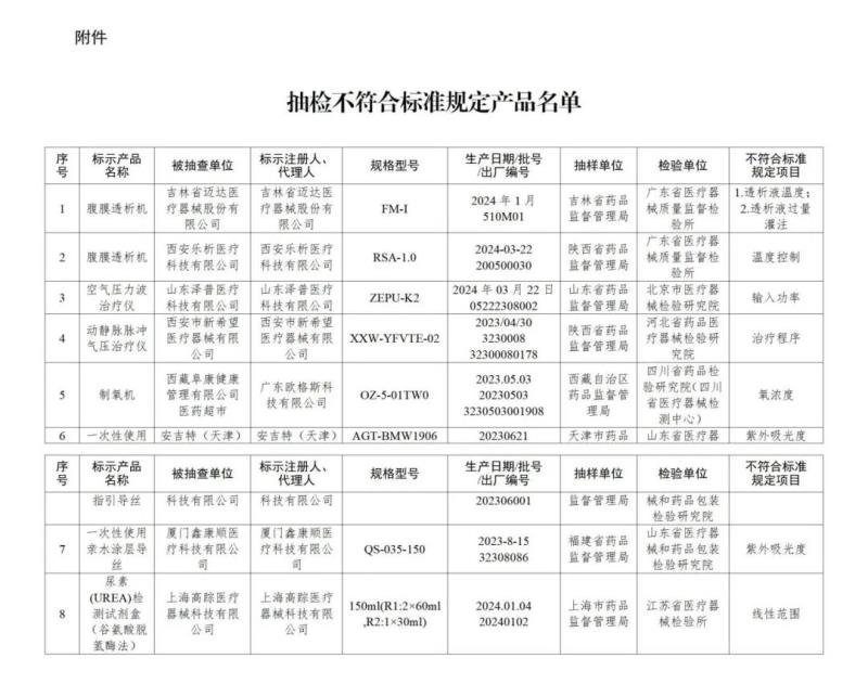 (一)腹膜透析設(shè)備2臺:分別為吉林省邁達(dá)醫(yī)療器械股份有限公司生產(chǎn),涉及透析液溫度、透析液過量灌注不符合標(biāo)準(zhǔn)規(guī)定;西安樂析醫(yī)療科技有限公司生產(chǎn),涉及溫度控制不符合標(biāo)準(zhǔn)規(guī)定。 (二)肢體加壓理療設(shè)備2臺:分別為山東澤普醫(yī)療科技有限公司生產(chǎn),涉及輸入功率不符合標(biāo)準(zhǔn)規(guī)定;西安市新希望醫(yī)療器械有限公司生產(chǎn),涉及治療程序不符合標(biāo)準(zhǔn)規(guī)定。 (三)醫(yī)用分子篩制氧機(jī)1臺:廣東歐格斯科技有限公司生產(chǎn),涉及氧濃度不符合標(biāo)準(zhǔn)規(guī)定。 (四)導(dǎo)絲2批:分別為安吉特(天津)科技有限公司、廈門鑫康順醫(yī)療科技有限公司生產(chǎn),涉及紫外吸光度不符合標(biāo)準(zhǔn)規(guī)定。 (五)尿素測定試劑盒1批:上海高蹤醫(yī)療器械科技有限公司生產(chǎn),涉及線性范圍不符合標(biāo)準(zhǔn)規(guī)定。