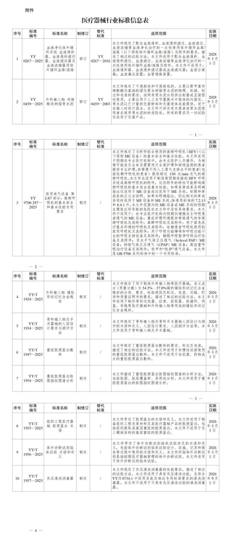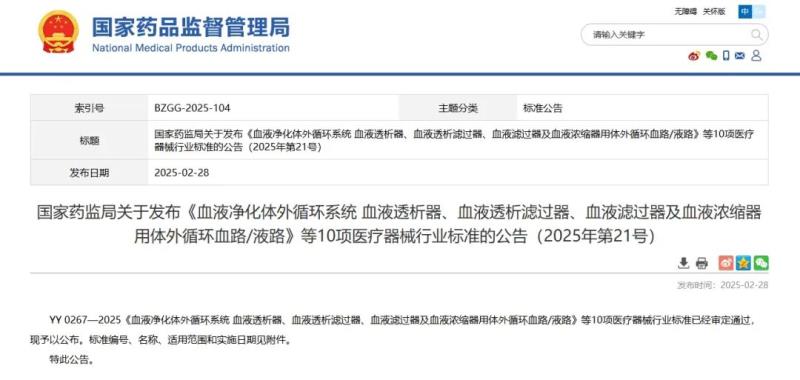2月28日,國家藥監(jiān)局發(fā)布YY 0267-2025《血液凈化體外循環(huán)系統(tǒng) 血液透析器、血液透析濾過器、血液濾過器及血液濃縮器用體外循環(huán)血路/液路》、YY 9706.287-2025《醫(yī)用電氣設(shè)備 第2-87部分:高頻呼吸機(jī)的基本安全和基本性能專用要求》、YY/T 1947-2025《重組膠原蛋白敷料》等10項(xiàng)醫(yī)療器械行業(yè)標(biāo)準(zhǔn),其中2項(xiàng)標(biāo)準(zhǔn)為修訂,8項(xiàng)為制定,最早自2026年3月1日起實(shí)施,具體明細(xì)如下: