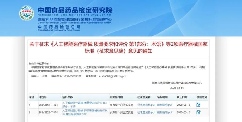 3月14日,國家藥監(jiān)局醫(yī)療器械標(biāo)準(zhǔn)管理中心發(fā)布《人工智能醫(yī)療器械 質(zhì)量要求和評價(jià) 第1部分:術(shù)語》《人工智能醫(yī)療器械 肺部影像輔助分析軟件 算法性能測試方法》2項(xiàng)醫(yī)療器械國家標(biāo)準(zhǔn)的征求意見稿,并向社會公開征求意見。