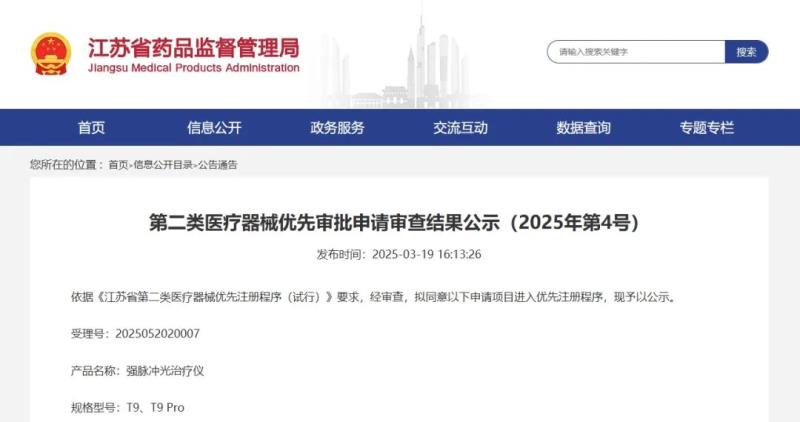 3月19日,江蘇省藥監(jiān)局發(fā)布一則第二類醫(yī)療器械優(yōu)先審批申請審查結(jié)果公示,其中提到,依據(jù)《江蘇省第二類醫(yī)療器械優(yōu)先注冊程序(試行)》要求,經(jīng)審查,擬同意大悅創(chuàng)新(蘇州)醫(yī)療科技股份有限公司申請的強脈沖光治療儀項目進入優(yōu)先注冊程序,并予以公示。