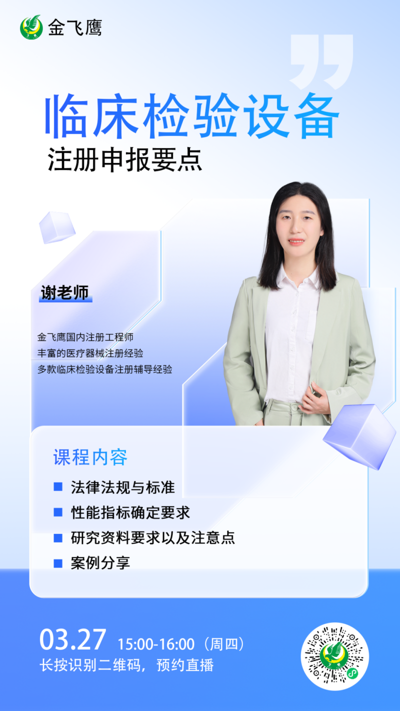 作為一家深耕醫(yī)療器械行業(yè)18年的專業(yè)咨詢公司,金飛鷹在臨床檢驗(yàn)設(shè)備注冊(cè)方面積累了豐富的實(shí)戰(zhàn)經(jīng)驗(yàn)(如核酸分子雜交儀、微陣列芯片掃描儀、幽門螺旋桿菌測(cè)試儀等),成功輔導(dǎo)了眾多企業(yè)完成注冊(cè)審批。因此,我們特別推出有關(guān)臨床檢驗(yàn)設(shè)備注冊(cè)的線上直播課,助力相關(guān)企業(yè)更高效地完成產(chǎn)品注冊(cè)申報(bào)。