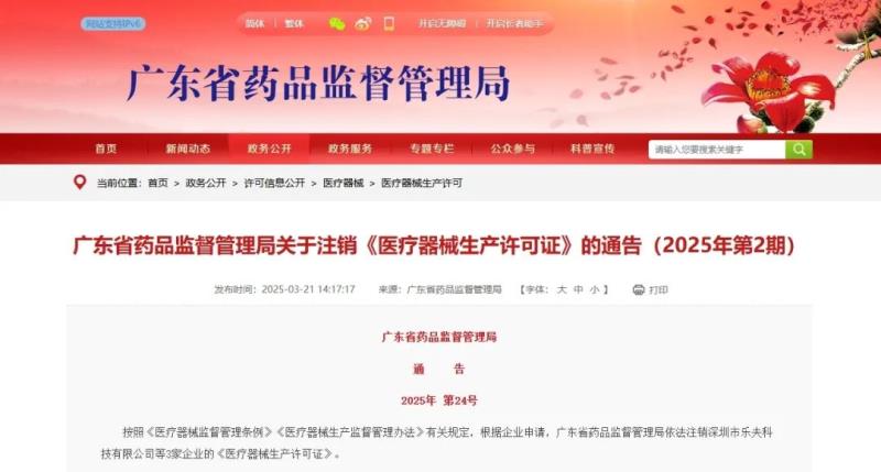 近日,廣東藥監(jiān)局發(fā)布通告稱,按照《醫(yī)療器械監(jiān)督管理?xiàng)l例》《醫(yī)療器械生產(chǎn)監(jiān)督管理辦法》有關(guān)規(guī)定,根據(jù)企業(yè)申請,該局已于依法注銷注銷深圳市樂夫科技有限公司、東莞市泰杉科技工業(yè)有限公司等3家企業(yè)的《醫(yī)療器械生產(chǎn)許可證》,具體明細(xì)如下: