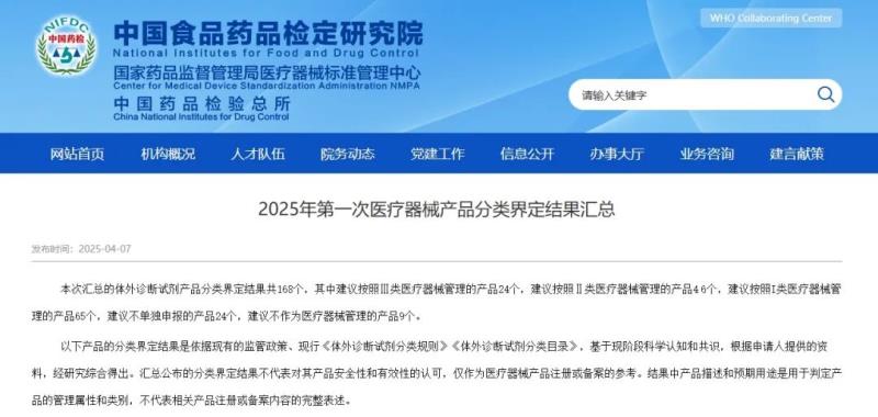 4月7日,國(guó)家藥監(jiān)局醫(yī)療器械標(biāo)準(zhǔn)管理中心發(fā)布《2025年第一次醫(yī)療器械產(chǎn)品分類界定結(jié)果匯總》,本次匯總的均為體外診斷試劑產(chǎn)品,共有168個(gè),其中建議按照Ⅲ類醫(yī)療器械管理的產(chǎn)品24個(gè),建議按照Ⅱ類醫(yī)療器械管理的產(chǎn)品46個(gè),建議按照Ⅰ類醫(yī)療器械管理的產(chǎn)品65個(gè),建議不單獨(dú)申報(bào)的產(chǎn)品24個(gè),建議不作為醫(yī)療器械管理的產(chǎn)品9個(gè)。