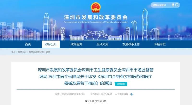 4月7日,深圳市發(fā)展和改革委員會、深圳市衛(wèi)生健康委員會、深圳市市場監(jiān)督管理局、深圳市醫(yī)療保障局四部門聯(lián)合發(fā)布《深圳市全鏈條支持醫(yī)藥和醫(yī)療器械發(fā)展若干措施》(以下簡稱《措施》),聚焦研發(fā)創(chuàng)新、人工智能應(yīng)用、臨床試驗(yàn)、注冊審批、生產(chǎn)制造、推廣應(yīng)用、企業(yè)出海、人才與金融賦能、投資促進(jìn)9大方面,共提出32條措施,以充分發(fā)揮深圳科技創(chuàng)新、先進(jìn)制造、深港合作等優(yōu)勢,大力發(fā)展醫(yī)藥和醫(yī)療器械研發(fā)經(jīng)濟(jì),全鏈條支持醫(yī)藥和醫(yī)療器械產(chǎn)業(yè)快速發(fā)展做大做強(qiáng),將深圳建設(shè)成為國內(nèi)領(lǐng)先、國際一流的醫(yī)藥和醫(yī)療器械產(chǎn)業(yè)集聚發(fā)展高地。