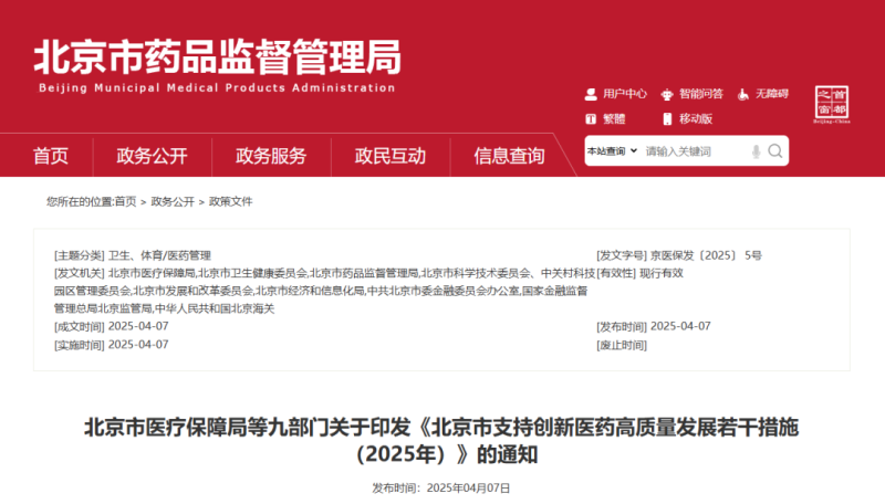 4月7日,北京市醫(yī)療保障局、北京市藥監(jiān)局等九部門發(fā)布《北京市支持創(chuàng)新醫(yī)藥高質(zhì)量發(fā)展若干措施(2025年)》(以下簡稱《措施》),《措施》共分為八個部分,包括:持續(xù)促進臨床試驗提質(zhì)增效(5條)、不斷提升審評審批效能(6條)、持續(xù)擴大創(chuàng)新醫(yī)藥生產(chǎn)流通(6條)、持續(xù)推動創(chuàng)新醫(yī)藥臨床使用(5條)、人工智能賦能醫(yī)藥創(chuàng)新發(fā)展(2條)、加強創(chuàng)新醫(yī)藥投融資支持(2條)、優(yōu)化創(chuàng)新醫(yī)藥產(chǎn)業(yè)布局(2條)和保障措施(4條)。