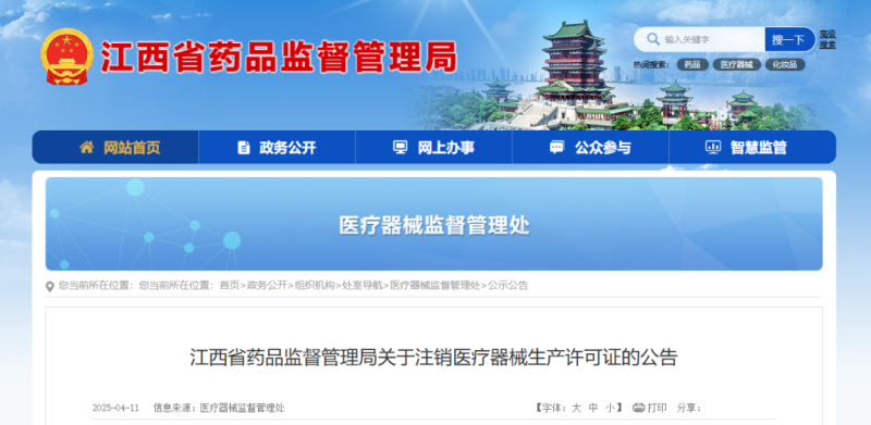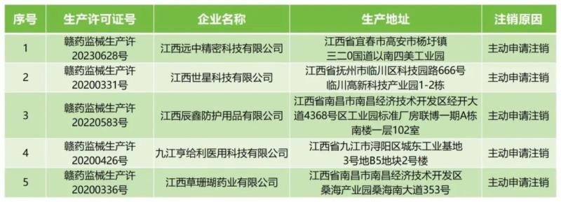 近日,江西省藥監(jiān)局發(fā)布公告稱,根據(jù)《中華人民共和國行政許可法》《醫(yī)療器械監(jiān)督管理條例》《醫(yī)療器械生產(chǎn)監(jiān)督管理辦法》規(guī)定,該局已依法注銷江西遠中精密科技有限公司、江西世星科技有限公司等5家企業(yè)的《醫(yī)療器械生產(chǎn)許可證》,注銷原因均為“主動申請注銷”,具體明細如下: