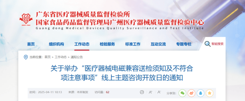 近日,廣東省醫(yī)療器械質(zhì)量監(jiān)督檢驗所官網(wǎng)發(fā)布通知,定于4月25日(周五)舉辦“醫(yī)療器械電磁兼容送檢須知及不符合項注意事項”線上主題咨詢開放日活動,具體時間及參會方式如下:
