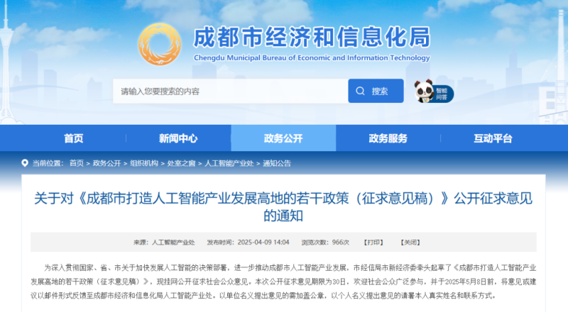 近日,成都市經(jīng)濟(jì)和信息化局發(fā)布《成都市打造人工智能產(chǎn)業(yè)發(fā)展高地的若干政策(征求意見稿)》(以下簡(jiǎn)稱《政策》),并向社會(huì)公開征求意見。《政策》從做強(qiáng)產(chǎn)業(yè)載體、拓展場(chǎng)景應(yīng)用、優(yōu)化算力供給、推動(dòng)模型應(yīng)用、盤活數(shù)據(jù)資源、鼓勵(lì)企業(yè)上榜、支持品牌推廣、引育頂尖人才、強(qiáng)化金融支持九個(gè)方面入手,進(jìn)一步推動(dòng)成都市人工智能產(chǎn)業(yè)發(fā)展,助推打造人工智能產(chǎn)業(yè)發(fā)展高地。