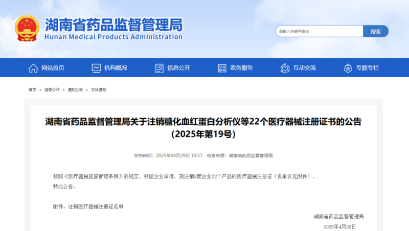 4月29日,湖南省藥監(jiān)局發(fā)布公告稱,按照《醫(yī)療器械監(jiān)督管理條例》的規(guī)定,根據(jù)企業(yè)申請,現(xiàn)注銷湖南普門醫(yī)療科技有限公司、湖南雷杜生物技術(shù)有限公司等8家企業(yè)的22個產(chǎn)品的醫(yī)療器械注冊證,具體明細如下: