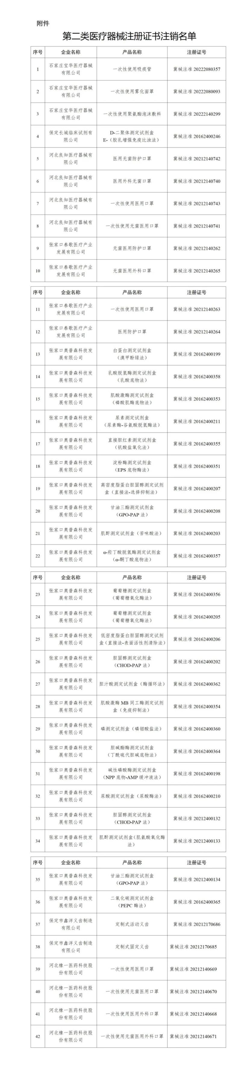 近日,河北省藥監(jiān)局發(fā)布公告稱,根據(jù)《中華人民共和國(guó)行政許可法》《醫(yī)療器械監(jiān)督管理?xiàng)l例》有關(guān)規(guī)定,依企業(yè)申請(qǐng),該局依法注銷了42個(gè)第二類醫(yī)療器械注冊(cè)證書,其中有12款產(chǎn)品為醫(yī)用口罩,還有一次性使用吸痰管、一次性使用霧化面罩、一次性使用聚氨酯泡沫敷料、定制式活動(dòng)義齒等,具體明細(xì)如下: