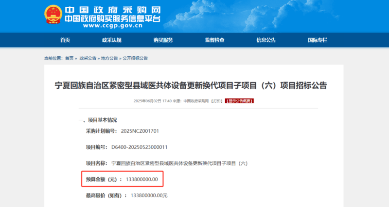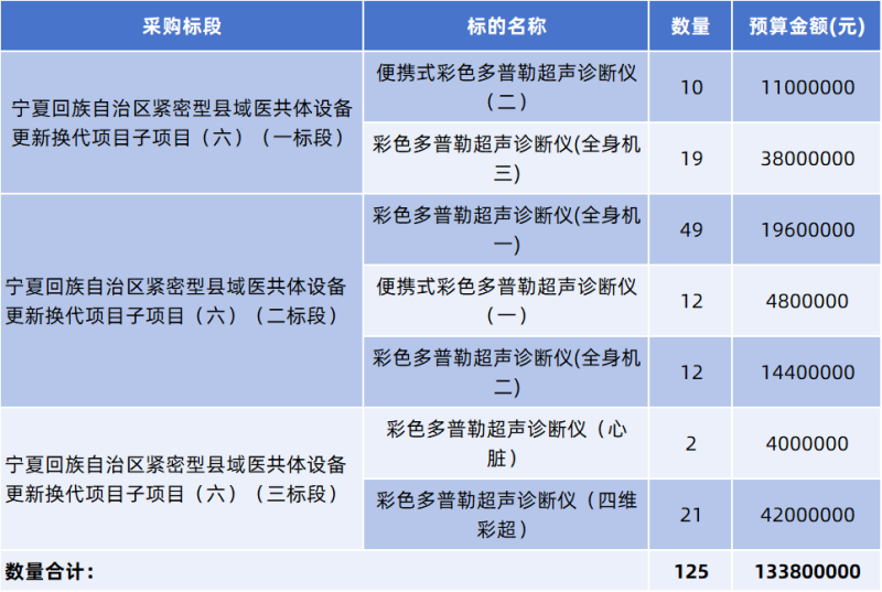 6月2日,中國政府采購網發(fā)布了《寧夏回族自治區(qū)緊密型縣域醫(yī)共體設備更新換代項目子項目(六)項目招標公告》,125臺彩色多普勒超聲診斷儀采購大單啟動。