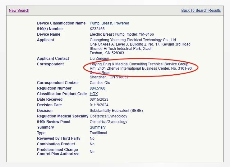 我們?cè)?/span>FDA 510(k)數(shù)據(jù)庫用產(chǎn)品代碼HGX進(jìn)行檢索,近兩年來由金飛鷹申報(bào)并作為官方Correspondent的有如下企業(yè)的吸奶器產(chǎn)品: