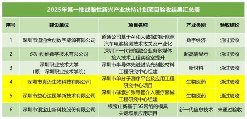 近日,深圳市發(fā)展和改革委員會公示了《2025年第一批戰(zhàn)略性新興產(chǎn)業(yè)扶持計劃項目驗收結(jié)果》,本期共有6個項目(5個通過驗收1個未通過驗收),5個通過驗收的項目中有2個為“生物醫(yī)藥”領(lǐng)域的,具體明細如下: