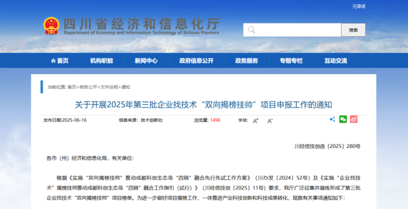(二)系統(tǒng)填報。6月30日18:00前,揭榜方須登錄四川省經(jīng)濟(jì)和信息化廳官方網(wǎng)站“益企服務(wù)超市”中“企業(yè)找技術(shù)揭榜掛帥”工作專欄,填寫提交揭榜申報書、揭榜方案、必要證明材料等。未在工作專欄中提交揭榜申報書及逾期申報的不予受理。