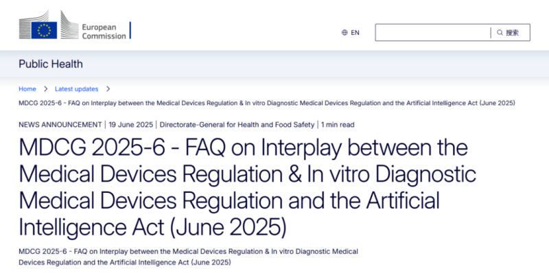 近日,歐盟委員會發(fā)布一份指南文件《關(guān)于醫(yī)療器械法規(guī)與體外診斷醫(yī)療器械法規(guī)與人工智能法案(2025年6月)之間相互作用的常見問題解答》,針對《人工智能法案》(AIA)與《醫(yī)療器械法規(guī)》(MDR)或《體外診斷醫(yī)療器械法規(guī)》(IVDR)聯(lián)合使用最常見問題,提供了相關(guān)解答方案。該常見問題解答(FAQ)主要面向(但不限于)醫(yī)療器械制造商、公告機(jī)構(gòu)及主管機(jī)構(gòu)。