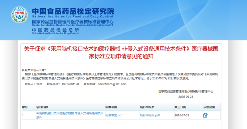 6月23日,國(guó)家藥監(jiān)局醫(yī)療器械標(biāo)管中心發(fā)布《采用腦機(jī)接口技術(shù)的醫(yī)療器械 非侵入式設(shè)備通用技術(shù)條件》醫(yī)療器械國(guó)家標(biāo)準(zhǔn)立項(xiàng)申請(qǐng),同時(shí)隨附了標(biāo)準(zhǔn)草案,并向社會(huì)公開(kāi)征求意見(jiàn)。