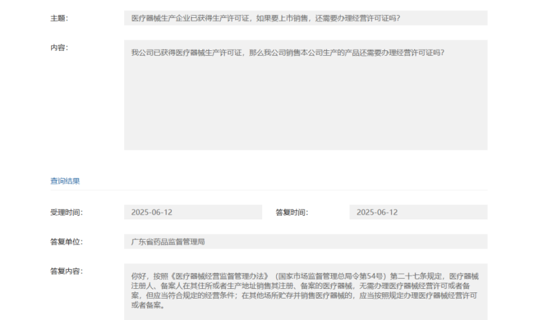 根據(jù)廣東省藥監(jiān)局的答復,按照《醫(yī)療器械經(jīng)營監(jiān)督管理辦法》(國家市場監(jiān)督管理總局令第54號)第二十七條規(guī)定,醫(yī)療器械注冊人、備案人在其住所或者生產(chǎn)地址銷售其注冊、備案的醫(yī)療器械,無需辦理醫(yī)療器械經(jīng)營許可或者備案,但應當符合規(guī)定的經(jīng)營條件;在其他場所貯存并銷售醫(yī)療器械的,應當按照規(guī)定辦理醫(yī)療器械經(jīng)營許可或者備案。