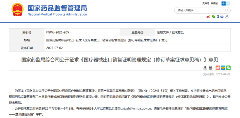 7月2日,國家藥監(jiān)局發(fā)布《醫(yī)療器械出口銷售證明管理規(guī)定(修訂草案征求意見稿)》(以下簡稱《規(guī)定》),并向社會公開征求意見。
