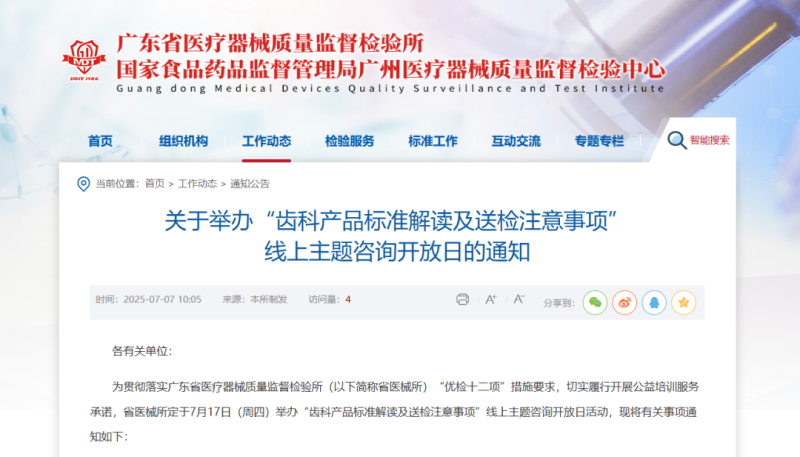 7月7日,廣東省醫(yī)療器械質(zhì)量監(jiān)督檢驗所官網(wǎng)發(fā)布通知稱,定于7月17日(周四)舉辦“齒科產(chǎn)品標準解讀及送檢注意事項”線上主題咨詢開放日活動,具體時間及參會方式如下: