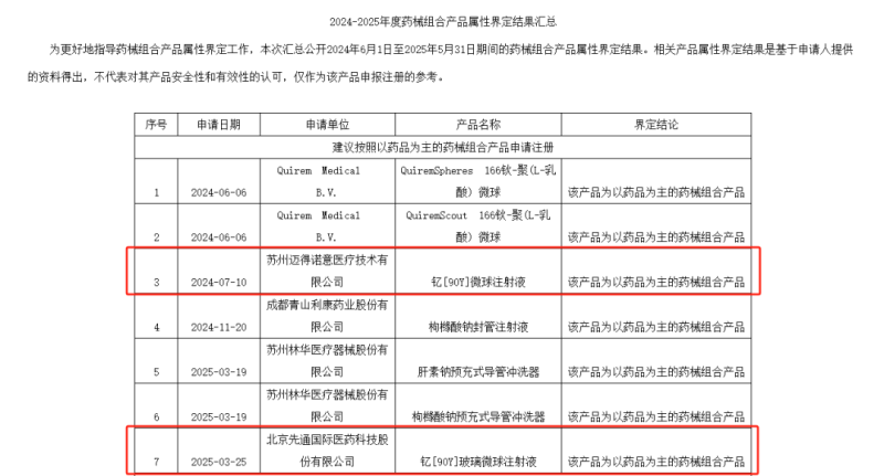 近日,中檢院發(fā)布了《2024-2025年度藥械組合產(chǎn)品屬性界定結(jié)果匯總》,其中有兩款被界定為“以藥品為主的藥械組合產(chǎn)品”引起了我們的注意——釔[90Y]微球注射液。