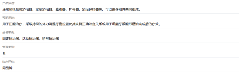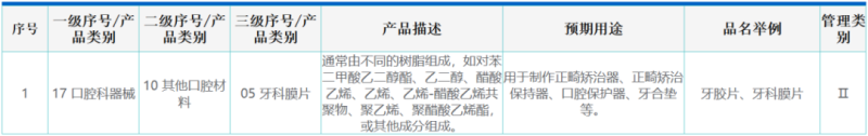 我們通過查看本次獲證產(chǎn)品的“結(jié)構(gòu)及組成”可以看到,此類產(chǎn)品“由具有醫(yī)療器械注冊證的牙科膜片經(jīng)壓制成型后打磨、拋光而成。”因此,牙膠片/牙科膜片是正畸矯治器最為關(guān)鍵的一項原材料,可以外購,也可以企業(yè)自己生產(chǎn),但前提是要有注冊證(同樣是Ⅱ類產(chǎn)品,分類編碼17-10-05)。