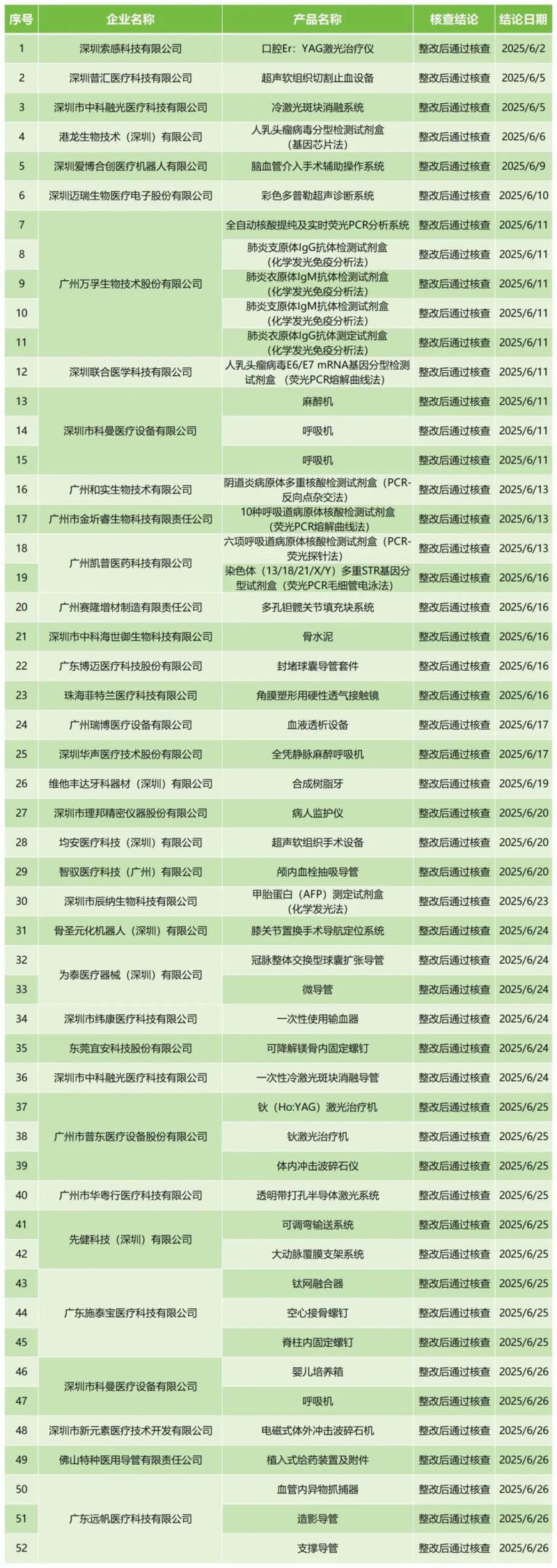 7月16日,廣東省藥監(jiān)局官網(wǎng)公布2025年6月醫(yī)療器械注冊質(zhì)量管理體系核查結(jié)果,包括深圳索感科技有限公司的口腔Er:YAG激光治療儀、廣州萬孚生物技術(shù)股份有限公司的全自動核酸提純及實(shí)時熒光PCR分析系統(tǒng)、廣州市普東醫(yī)療設(shè)備股份有限公司的鈥(Ho:YAG)激光治療機(jī)、深圳市科曼醫(yī)療設(shè)備有限公司的呼吸機(jī)等共計52款產(chǎn)品,均為“整改后通過核查”。具體明細(xì)見下方表格: