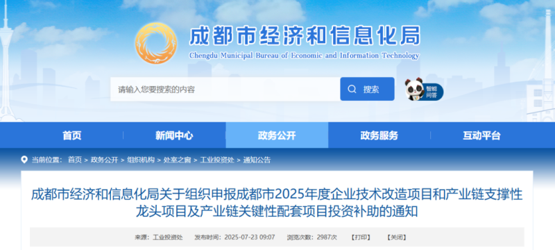7月23日,成都市經(jīng)濟(jì)和信息化局發(fā)布《關(guān)于組織申報(bào)成都市2025年度企業(yè)技術(shù)改造項(xiàng)目和產(chǎn)業(yè)鏈支撐性龍頭項(xiàng)目及產(chǎn)業(yè)鏈關(guān)鍵性配套項(xiàng)目投資補(bǔ)助的通知》(以下簡(jiǎn)稱《通知》),其中提到,對(duì)符合條件的企業(yè),給予最高1000萬(wàn)元補(bǔ)助。《通知》具體內(nèi)容如下:
