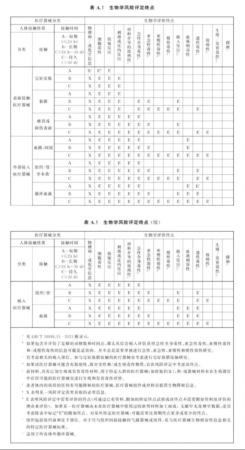 按照上述接觸性質(zhì)和接觸時(shí)間2個(gè)分類原則確定了醫(yī)療器械類別之后,再根據(jù)標(biāo)準(zhǔn)GB/T 16886.1-2022的附錄A表A.1給醫(yī)療器械找出相對(duì)應(yīng)的生物相容性檢驗(yàn)項(xiàng)目。