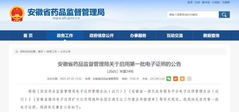 電子證照同步在安徽省藥品監(jiān)督管理局門戶網(wǎng)站電子證照公示欄目(https://mpa.ah.gov.cn)公示。該公告同時(shí)提到,電子證照啟用前該局已頒發(fā)的相關(guān)紙質(zhì)證書(含正本、副本、附頁和變更記錄頁),在有效期內(nèi)繼續(xù)使用。