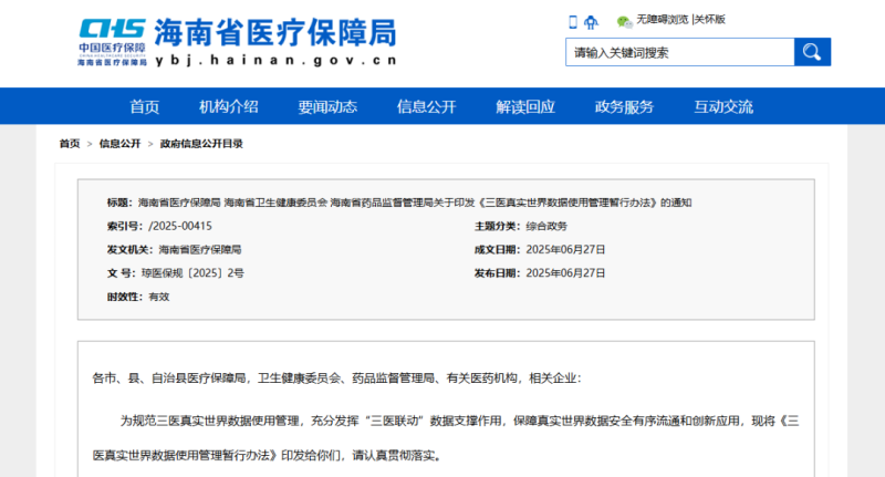 近日,海南省醫(yī)療保障局、海南省衛(wèi)生健康委員會(huì)、海南省藥品監(jiān)督管理局聯(lián)合印發(fā)《三醫(yī)真實(shí)世界數(shù)據(jù)使用管理暫行辦法》(以下簡(jiǎn)稱(chēng)《辦法》),自2025年8月1日起正式施行,有效期5年。作為國(guó)內(nèi)首個(gè)明確整合醫(yī)療、醫(yī)保、醫(yī)藥(以下簡(jiǎn)稱(chēng)“三醫(yī)”)三方真實(shí)世界數(shù)據(jù)資源并規(guī)范其應(yīng)用的管理文件,《辦法》的出臺(tái)標(biāo)志著海南在利用真實(shí)世界證據(jù)支持藥械研發(fā)與評(píng)審、優(yōu)化醫(yī)保決策方面邁出關(guān)鍵一步。