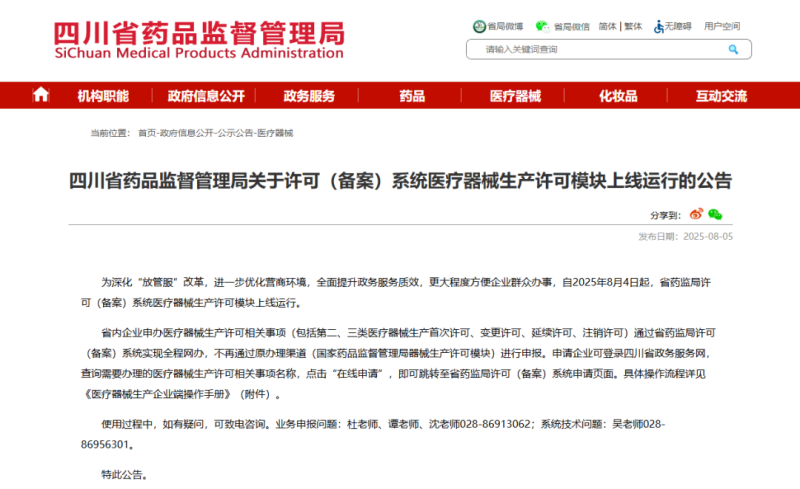 8月4日,四川省藥監(jiān)局發(fā)布《關(guān)于許可(備案)系統(tǒng)醫(yī)療器械生產(chǎn)許可模塊上線運(yùn)行的公告》(以下簡稱《公告》),其中提到,自2025年8月4日起,省藥監(jiān)局許可(備案)系統(tǒng)醫(yī)療器械生產(chǎn)許可模塊上線運(yùn)行。