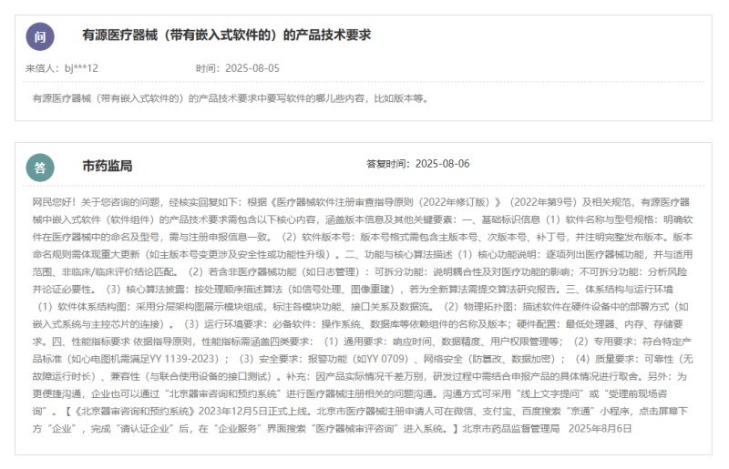 根據北京市藥監(jiān)局的答復,根據《醫(yī)療器械軟件注冊審查指導原則(2022年修訂版)》及相關規(guī)范,有源醫(yī)療器械中嵌入式軟件(軟件組件)的產品技術要求需包含以下核心內容,涵蓋版本信息及其他關鍵要素: