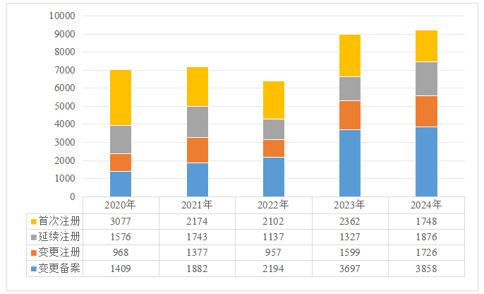 按受理注冊類型區(qū)分,2024年受理首次注冊1748項,同比降低26.0%;受理延續(xù)注冊1876項,同比增加41.4%;受理變更注冊1726項,同比增加7.9%;受理變更備案3858項,同比增加4.4%。