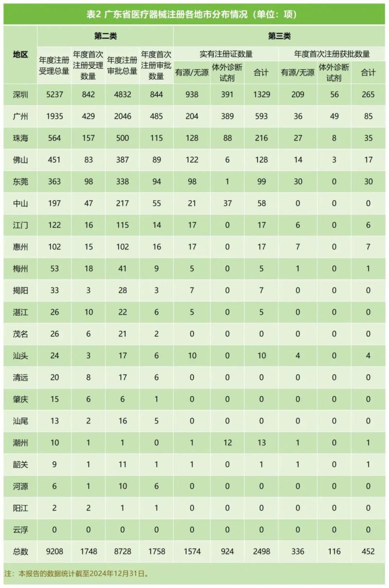 2024年,廣東省各地市第二類醫(yī)療器械注冊受理和審批分布情況、第二類醫(yī)療器械首次注冊受理和審批分布情況、第三類醫(yī)療器械首次注冊獲批情況及截至2024年底各地市實有第三類醫(yī)療器械注冊證情況見表2。