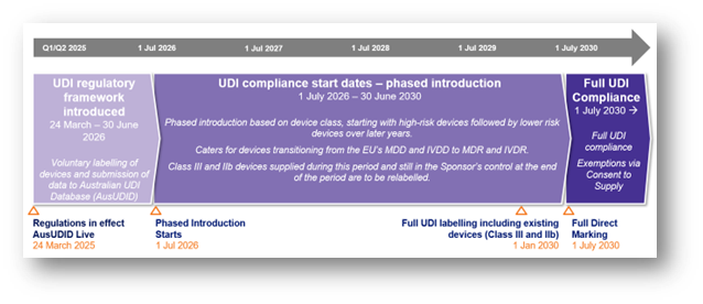 這其中,最早實(shí)施UDI的為Ⅲ類及Ⅱb類醫(yī)療器械,需要在2026年7月1日起將UDI載體放在設(shè)備標(biāo)簽上及向AusUDID 提交 UDI-DI 和相關(guān)數(shù)據(jù),最晚的則是1類和2類IVD,需要在2030年1月1日完成有關(guān)UDI的所有操作。
