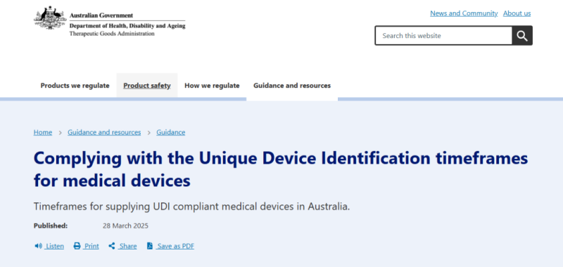 TGA在此前發(fā)布的Complying with the Unique Device Identification timeframes for medical devices中提到,TGA將在5年內(nèi)引入UDI:首先是高風(fēng)險(xiǎn)醫(yī)療器械的合規(guī)性,然后是低風(fēng)險(xiǎn)設(shè)備的合規(guī)性。